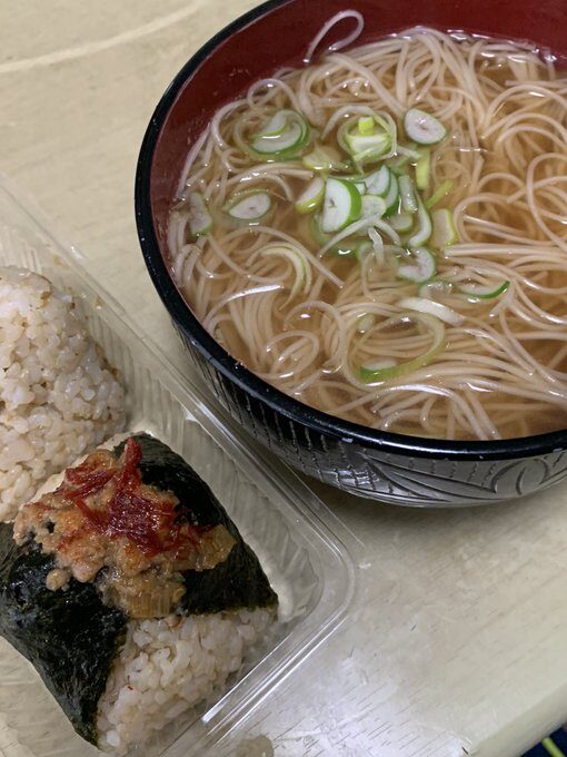 つゆは水、オイスターソース、鶏がらスープの素、鰹節をレンチンしたカツオ粉、生姜のすりおろし、黒胡椒、砂糖、酒とき片栗粉で作成 おにぎりを買ってきてくれたので炭水化物祭り