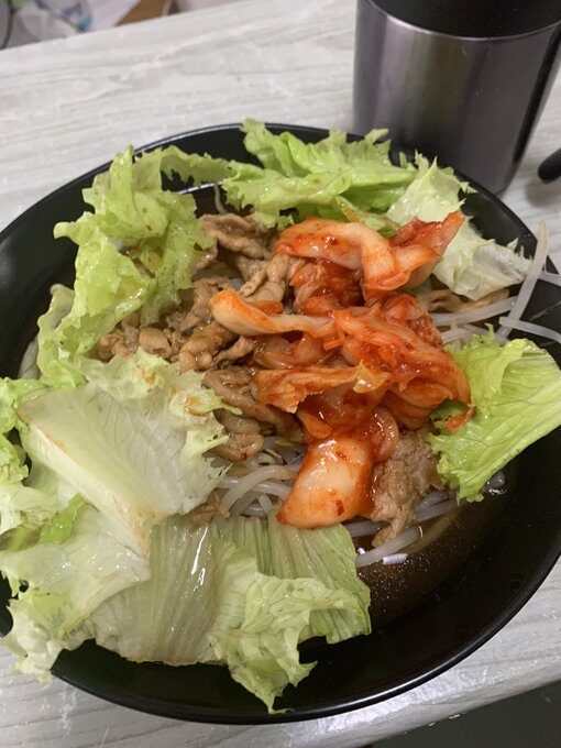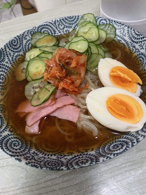 キムチの盛岡冷麺と昨日の手羽先の残り