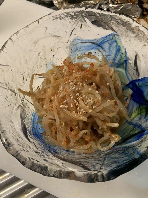 おつまみに無限モヤシを作った! ①モヤシをレンチンして水で冷やし、ザルで押し固めて水気を抜く ②①に味噌、醤油、おろしニンニク、味の素、胡麻油、一味唐辛子を追加しもみこみ、冷蔵庫で冷やす 最後に胡麻をかけて完成!