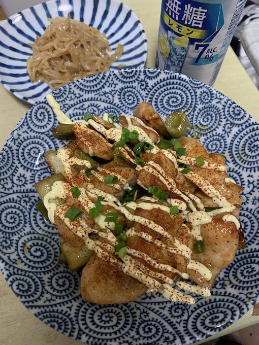 鶏とネギの照り焼きを作った。マヨネーズと七味をかけ完成 副菜でモヤシのナムルも作った!