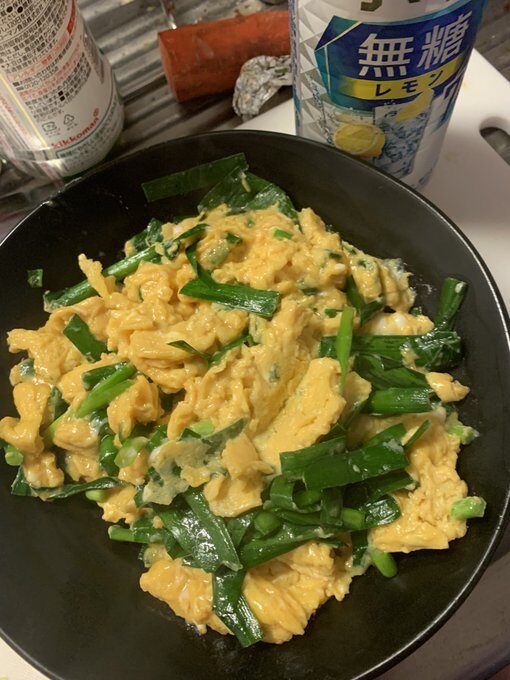 ニラ玉完成! 切ったニラをさっと炒め、白胡椒、塩、オイスターソース、味の素で調味した溶き卵に入れてさらに炒めて少し半熟めで作成!