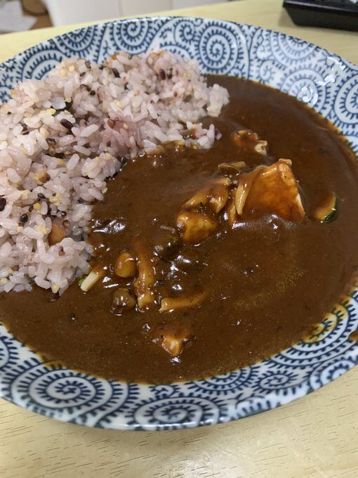 16穀米ご飯にレトルトカレーに鶏肉とシメジとズッキーニを追加してもらった。
