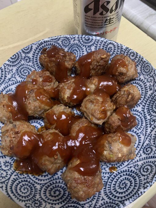酒のつまみに中華風肉団子を作った! タレはケチャップ、醤油、お酢、酒、水溶き片栗粉、砂糖、味の素で酢豚風 レンコンがシャキシャキして生姜が効いていて我ながら美味い。