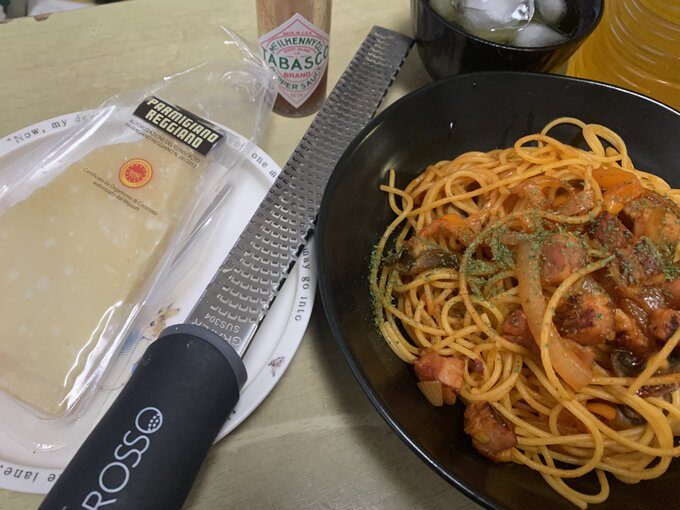 まだ家族が帰ってきていないが、お腹すいたので、早めに1人でいただきます! ハードチーズを削ってかけると本格的なナポリタンになる。