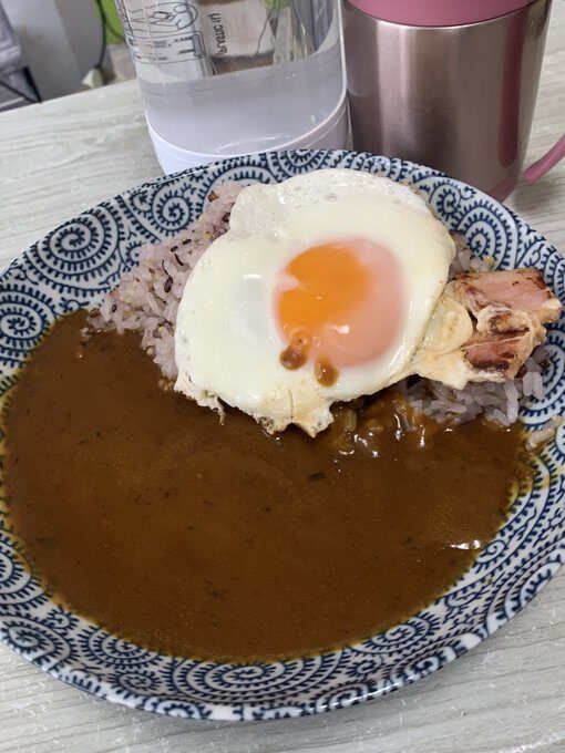- 5月3日 昼 レトルトカレーに半熟玉子とベーコンのせアレンジ