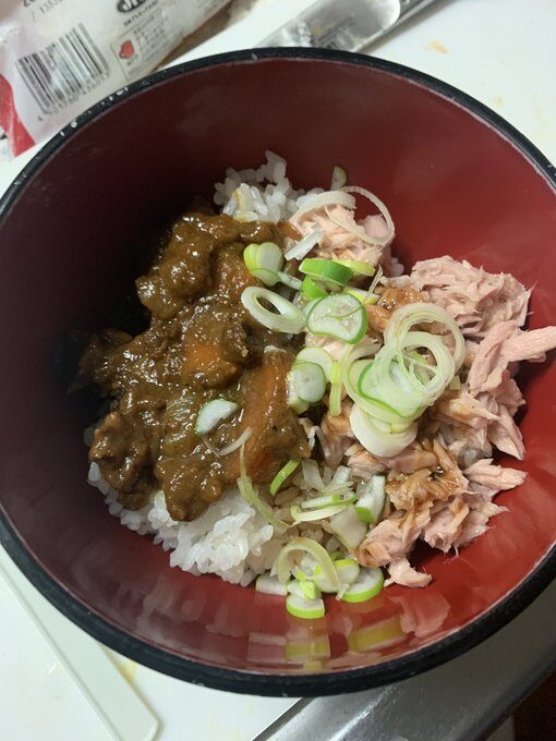 昨夜のカレーの残りとツナ缶に焼肉のタレかけハーフ&ハーフご飯。