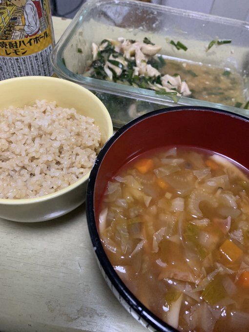 6月1日 夜 鶏肉とニラの煮物とミネストローネスープと玄米ご飯