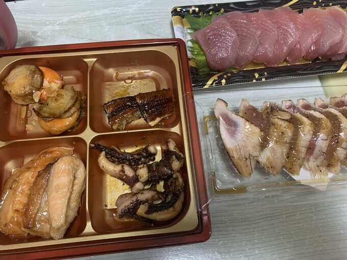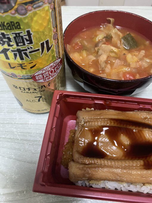 吉祥寺で買ってきてもらった穴子丼の半分とミネストローネ。