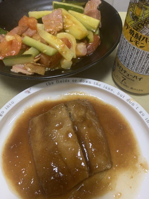 バルシステムで頼んだサバのみぞれ煮とズッキーニとトマトとベーコンの炒め物を作ってもらった。