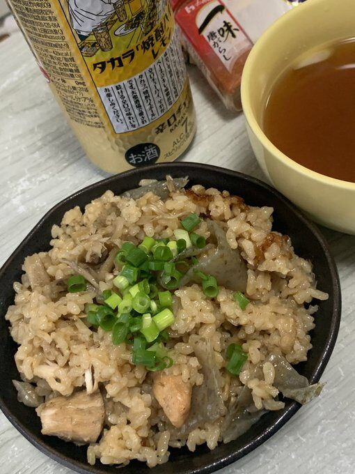 鶏とゴボウと蒟蒻の炊き込みご飯を作った。