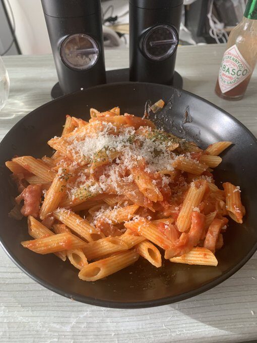 ニンニクとタマネギのみじん切り、ベーコンをオリーブオイルで炒めて、炒まってきたらトマト缶、コンソメを入れ煮詰める。 これに茹でたペンネを入れ、絡めてパセリ、粉チーズをかけて完成!