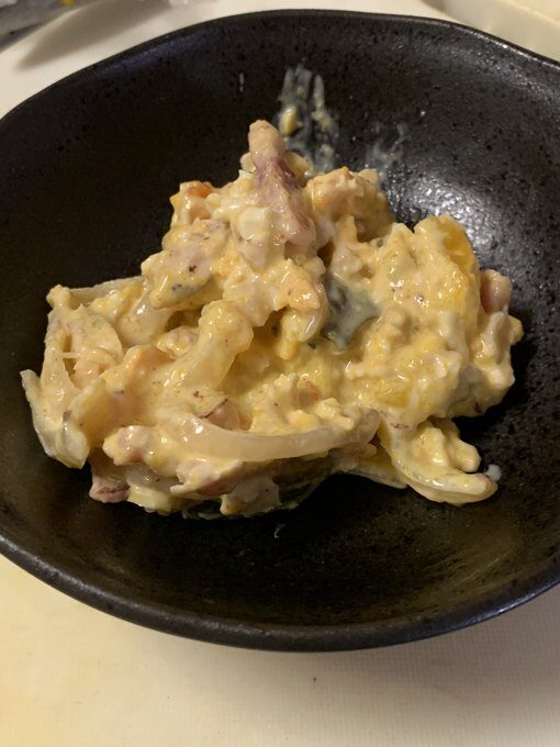 ①に②をいれかき混ぜ粗熱をとり、マヨネーズ、塩、酢、味の素、おろしニンニクで調味