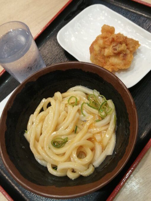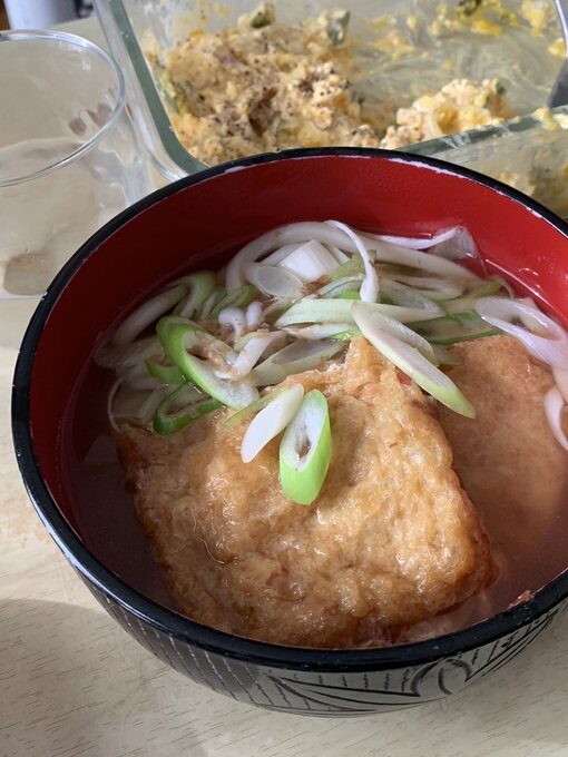 水に醤油、みりん、酒、カツオ粉、味の素を入れつゆを作成 油揚げをこれとは別に上の調味料と同じもので水分がなくなるまで煮込み、揚げに味を吸わせる。 解凍した冷凍うどんと長ネギをつゆに入れ、揚げを乗っけて完成!