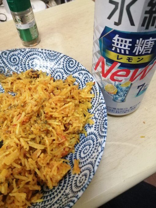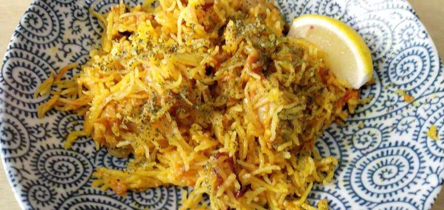 作り置きしてくれたビリヤニというインド料理。ジャガイモのような食感の米を炊いたピラフでカルダモンとか使ったカレー風味。レモンを絞ってかける。