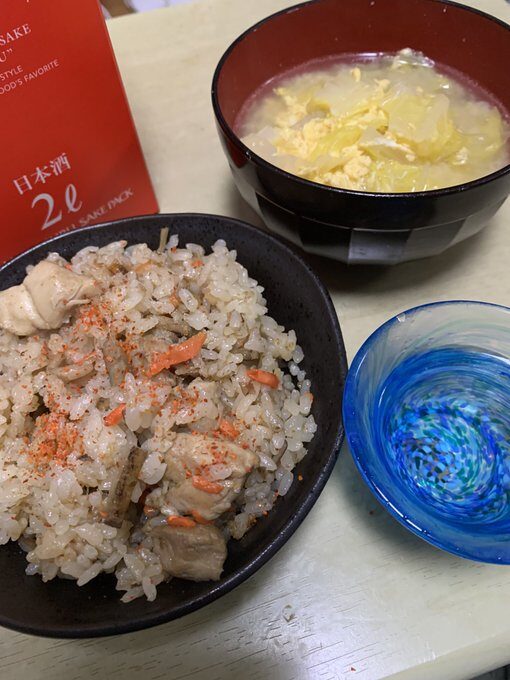 奥さんはパート、息子は塾の講師のアルバイトに出ているので鶏肉とゴボウとニンジン、生姜で炊き込みご飯を作った!