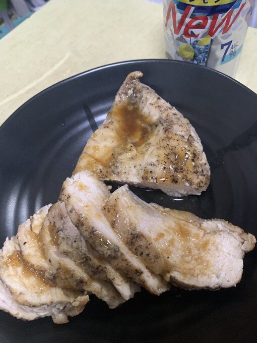 鶏むね肉を塩とすりおろしニンニクと黒胡椒を振りすり込み放置 味が馴染んだら、オリーブオイルで表面だけパリパリに焼く その後、レンチンしてアルミホイルとミトンに包み熱を通す。