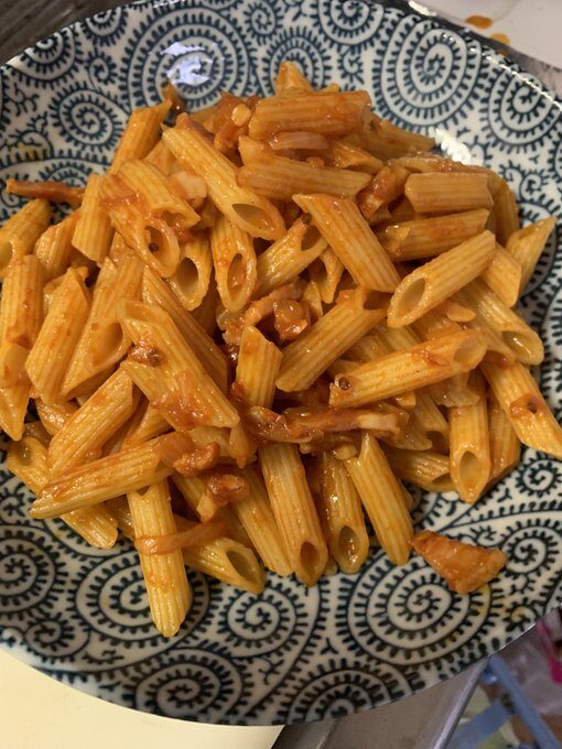 フライパンにベーコンとニンニクとタマネギにみじん切り、水に付けた唐辛子を切りオリーブオイルで炒める。 トマトソース缶とコンソメと唐辛子つけたあとの水を入れ水分を飛ばす。 別に茹でたペンネを入れ完成!