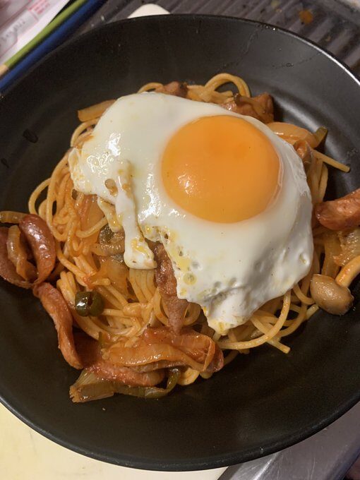タマネギ、ピーマン、ブナしめじ、ソーセージを切り炒める、ケチャップを入れ煮詰めてソースを作る。茹でたパスタをソースにあえて完成! 最後に目玉焼きとおろしたチーズをかけた。