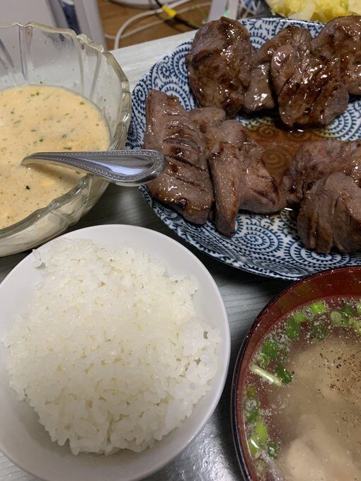 ふるさと納税で届いた牛タンにとろろご飯などをつけて牛タン定食