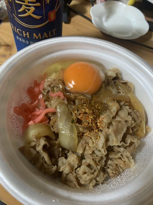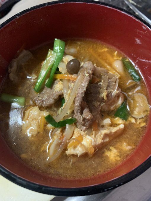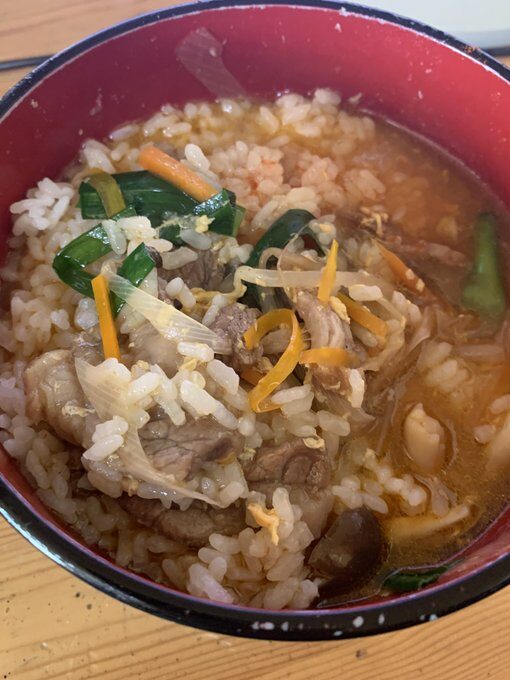 カルビ牛肉を胡麻油でフライパンにて炒め水を入れ、醤油、コチュジャン、砂糖、ウェイパーで調味。 おろしたニンニクと生姜とニラ、ニンジン、長ネギ、しめじを入れ煮込む 溶き卵、ご飯を入れ完成