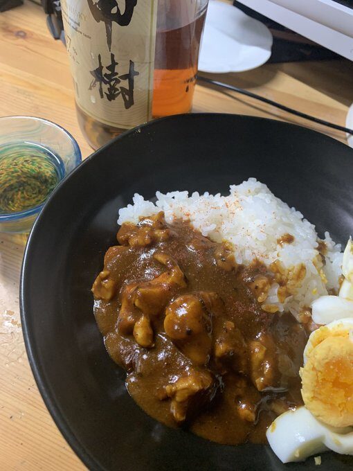 鶏もも肉の賞味期限が切れそうだったので、塩コショウとカレー粉と酒を入れて炒め、レトルトカレーを入れた。 最後にゆで卵をトッピング!