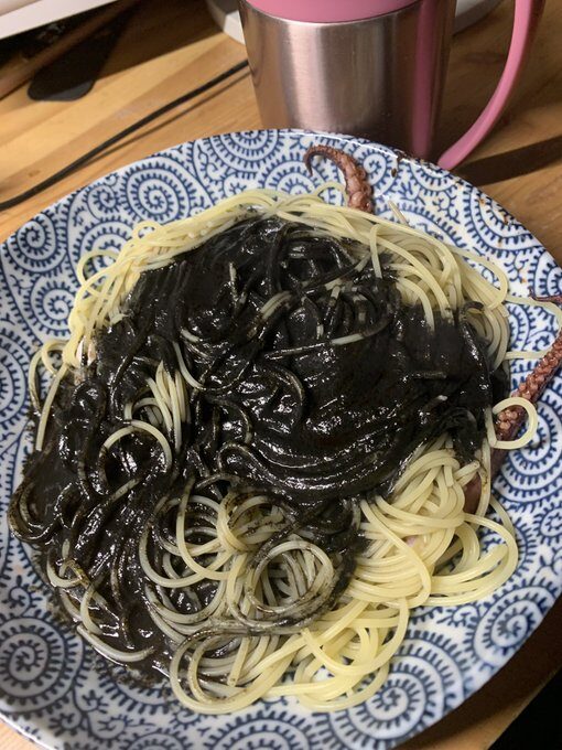 イカスミソースを買って来たので奥さん作。ふるさと納税のホタテも入っている。 こんにゃくパスタを使用