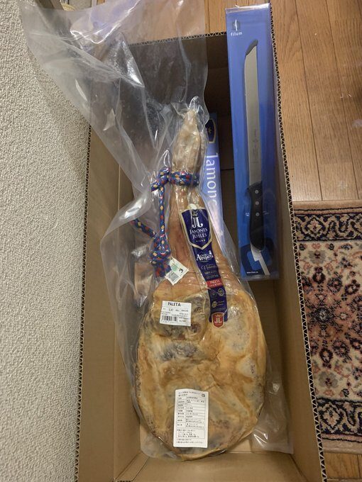 5キロの生ハムの原木と台や保護カバーなどのセット ジェイソンが持っていそうな、マチェーテのようなロングサイズのナイフも同梱 表面は脂などでコーティングされているのでかなり削ぎ落としてから食べるらしい。 奥さんの食への飽くなき探究心に脱帽