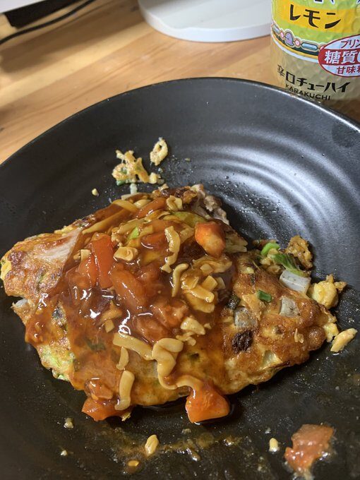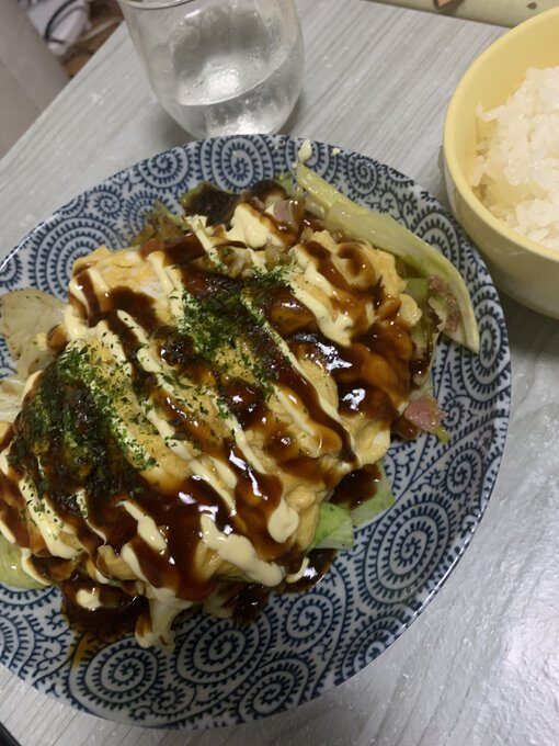 豚こま肉とキャベツを炒め、鰹節、塩胡椒、味の素で味付け 生玉子に塩胡椒、水、油を入れ撹拌し卵焼きを作り上に盛り付け おたふくソース、マヨネーズ、青のりをかけ完成!