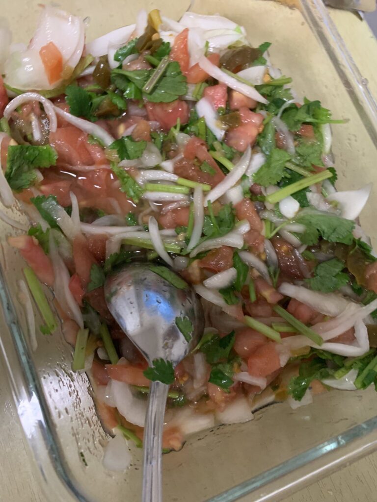 カルニタスとトマトとパクチー、玉ねぎ、ハラペーニョのサルサをはさんで食す。