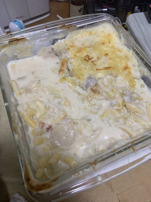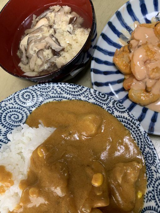 作ってもらったバターチキンカレーと作りたかったので作った副菜のエビマヨとレンチン茶碗蒸し エビマヨは美味しくできたが、茶碗蒸しは上手く固まらず卵スープと化した。