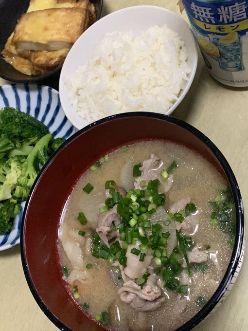 作り置きしてもらった豚汁とチーズ揚げだし豆腐とブロッコリー