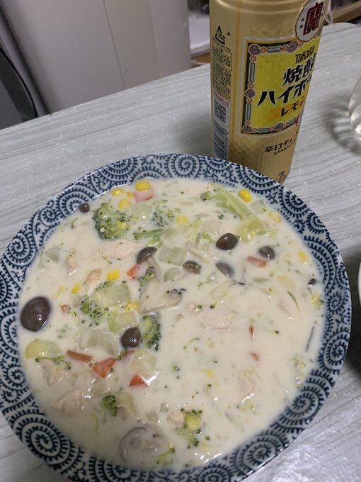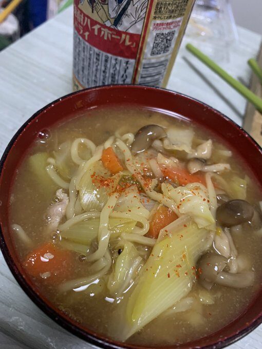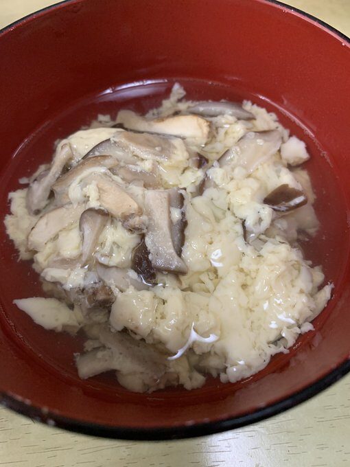 高野豆腐と鶏肉の汁物 昼は業務に追われて菓子パンひとつだったのでお腹空いた。