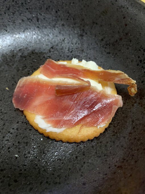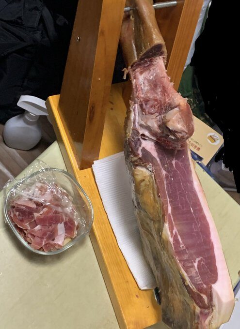 奥さんが食への探究心で買った生ハム5キロの原木 少し切り分けてもらった。 スーパーで買ってきた生ハムと違いチーズのような濃厚な味がする。