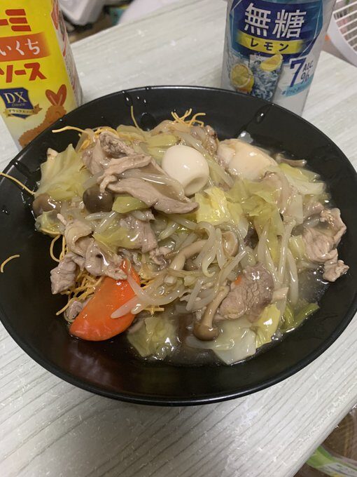 生卵を落としてもいい。 焼肉のタレがないのでオイスターソースを使った。