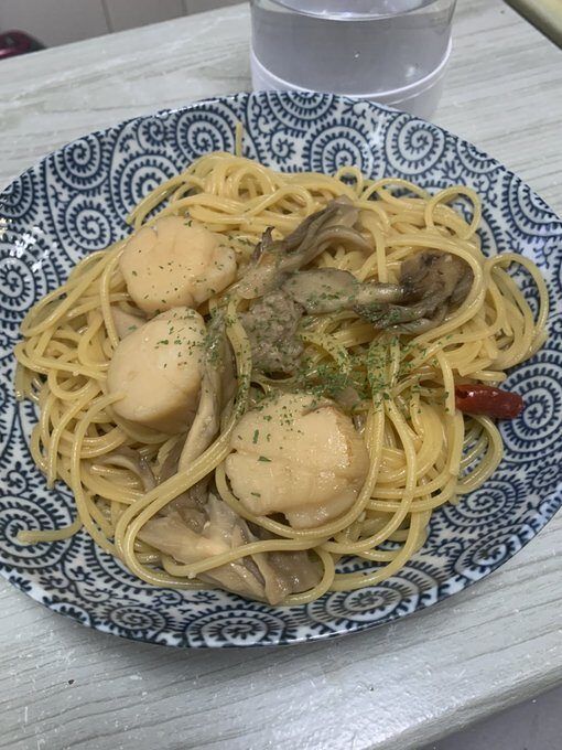 ホタテと舞茸のペペロンチーノを作ってもらった。