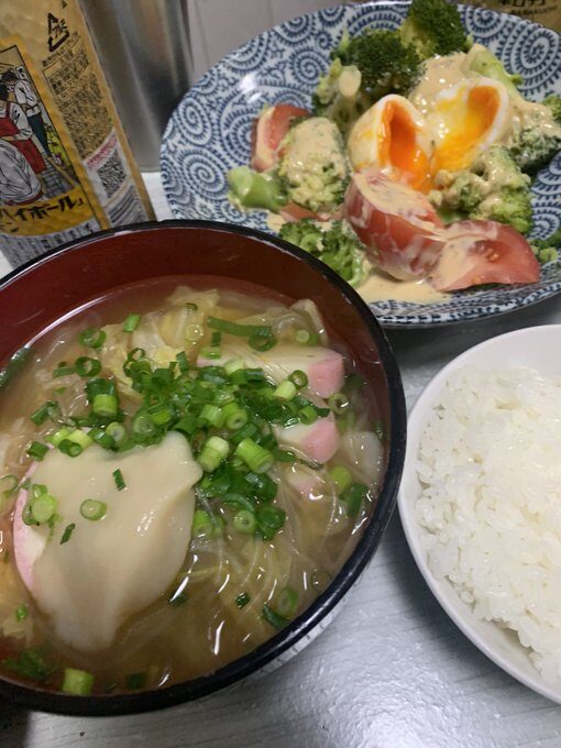 2月21日 夜 水餃子と春雨の野菜スープとブロッコリーと半熟玉子のサラダ