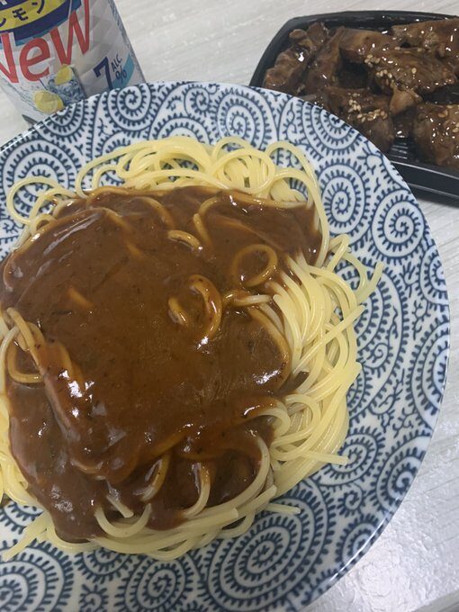 パスタにレトルトカレーをかけた簡単パスタと買ってきた惣菜のレバーの甘煮