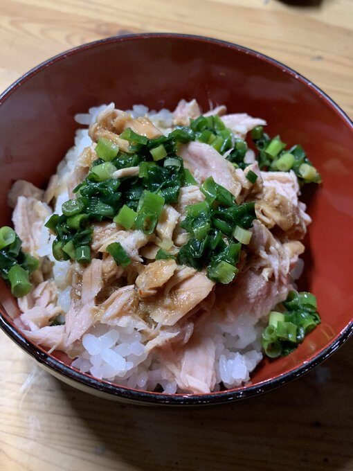 ご飯に油を切ったツナ缶と長ネギをかけて、焼肉のタレをかけた。