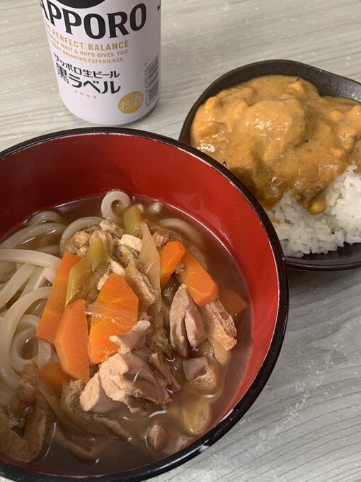 作りおいてくれたけんちん汁風のスープに解凍して入れたうどんと、昨日のバターチキンカレーのミニサイズ