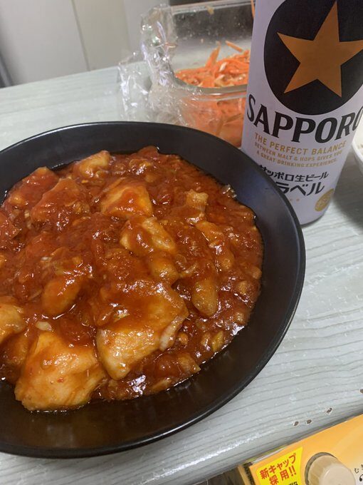 鶏むね肉のチリソース ①鶏むね肉を酒と片栗粉でコーティングして焼く  ②フライパンにニンニクと生姜をみじんぎりにして豆板醤で炒め煮詰まったら、トマト缶、鶏がらスープの素、オイスターソースをいれ長ネギ追加して煮る ③②に①を入れ完成